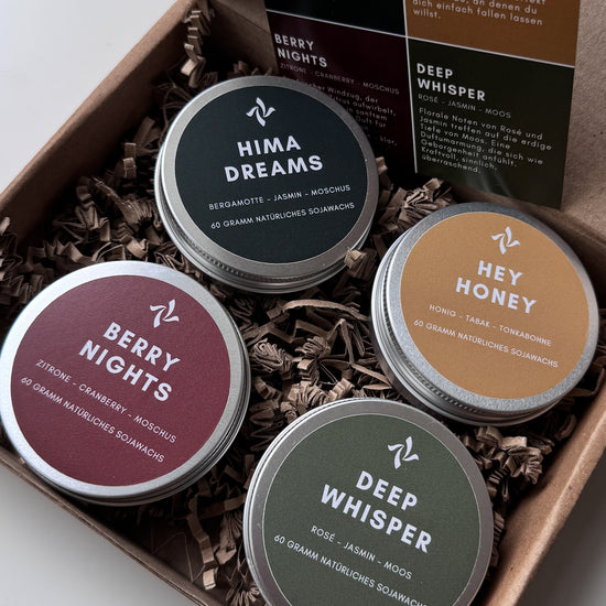 Jede Box enthält vier 60-ml-Kerzen mit folgenden Düften: