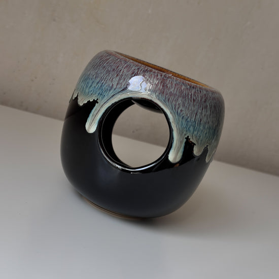 Die Duftlampe aus Keramik verbindet Funktion und Design. Sie verbreitet deinen Lieblingsduft gleichmäßig und sorgt für eine entspannte Atmosphäre. Durch den handgearbeiteten Farbverlauf in Schwarz, Blau und Braun ist jede Lampe ein echtes Unikat.